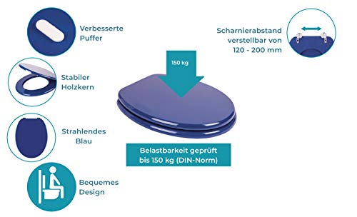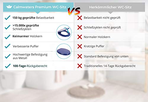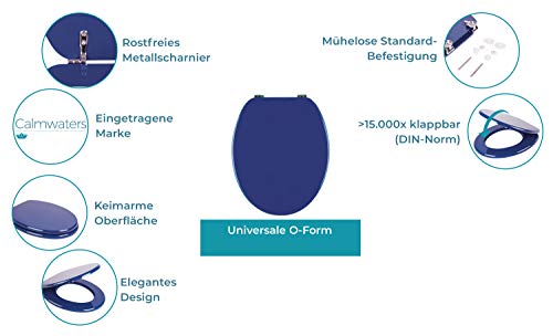 Calmwaters WC Sitz blau: Deckel & Sitz sind mit max. 150 kg Belastbarkeit geprüft. Massiver Holzkern – Oval – Qualitativ hochwertige befestigung aus Mettal – Strapazierfähig – Resistent gegen leichte Kratzer.
